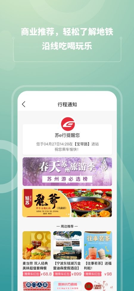 苏州游玩,就用苏e行!一码在手,畅游苏州!苏e行结合苏州城市文化及地铁出行场景,围绕 “地铁大脑” 构建公共交通智慧出行,利用LBS、物联网、大数据、人工智能等先进技术为乘客提供:扫码过闸、乘车服务、附近地铁商业,同时为苏州本地商家提供2265用户引流、活动推广等服务,构建互联网化的苏州城市生活服务。