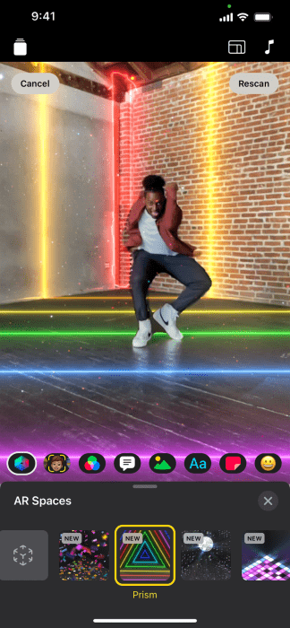 -七种 ar 空间供您选择,包括发光的彩虹条、五彩纸屑四散的欢庆效果、魔幻星尘、悦动舞池等等