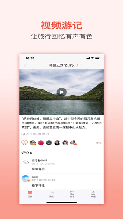 这是个很好用的旅行服务软件,在软件上面记录旅行的美好点滴,让每一次旅行都成为难忘的回忆。每人都有一本属于自己的旅行笔记。