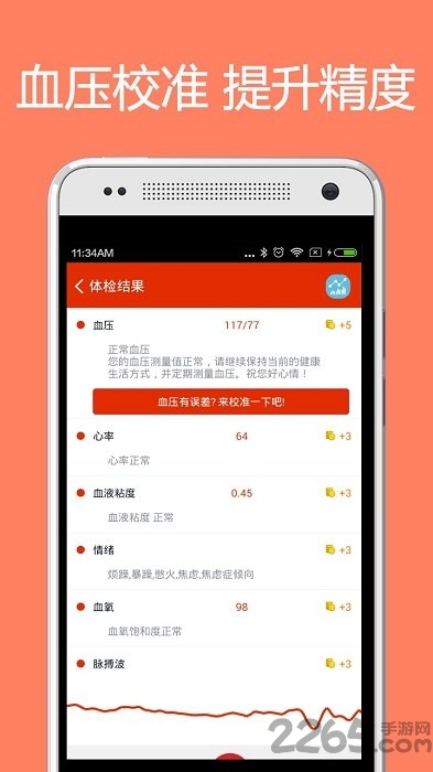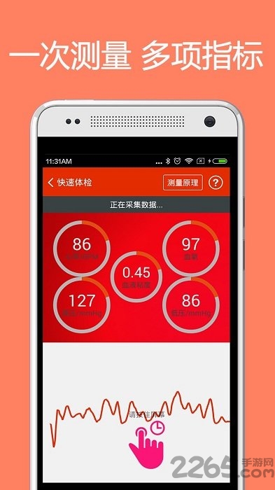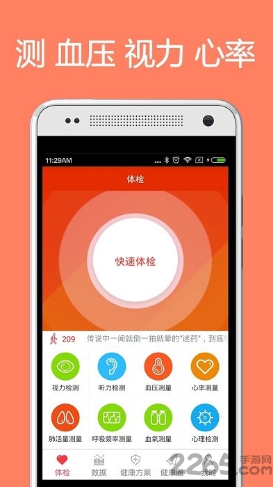 通过分析你指尖的血液流速来测量心率。这是安卓设备的心脏速率监视器。结果是即时的。实时检查您的心脏速率。无需任何外设,体检宝直接用手机测量用户的血压、心率、视力、听力、肺活量、心理指数、色盲等身体数据,并提供有针对性的可交互的健康方案。