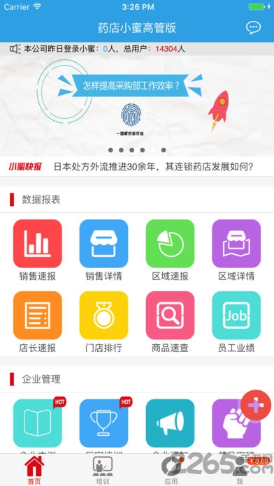 药店小蜜APP是医药行业经营者的贴身小秘书,能随时随地掌握企业经营数据,通过报表了解企业运行情况;实现企业内部信息快速传递,强化企业内部管理;通过企业在线培训,提升员工专业知识和职业技能,利用碎片化时间及时获得行业资讯;通过友好的交互界面,用数据驱动员工关注度,用数据驱动管理执行力,从而提升整体业绩。
