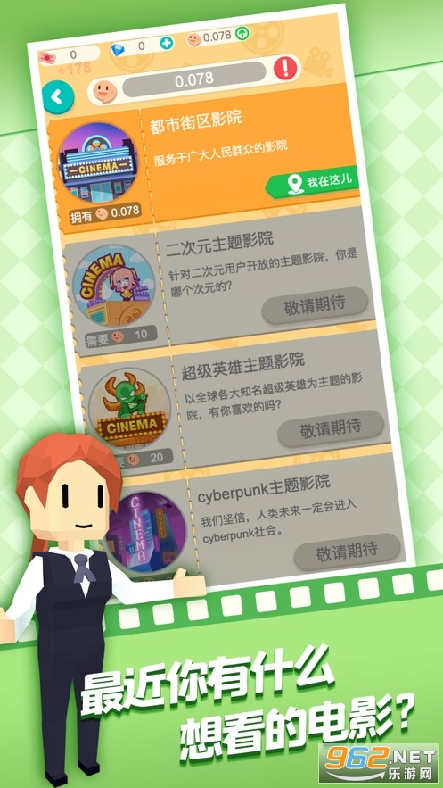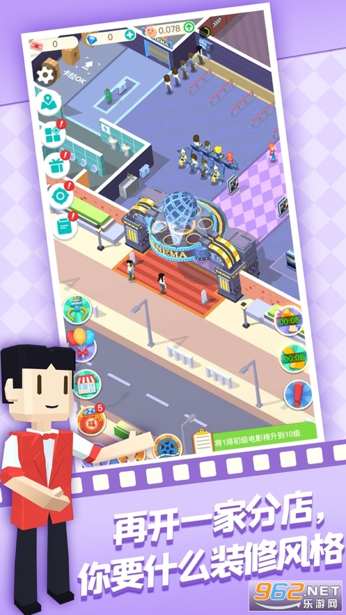 这是一个即满足你看电影又满足你当老板愿望的经营游戏,在这里你可以引进自己喜欢的影片,也可以雇佣你喜欢的员工,当然,最重要的是,你可以把影院装修的豪华奢侈,躺着赚很多小钱钱,有空的时候,就来试试吧!