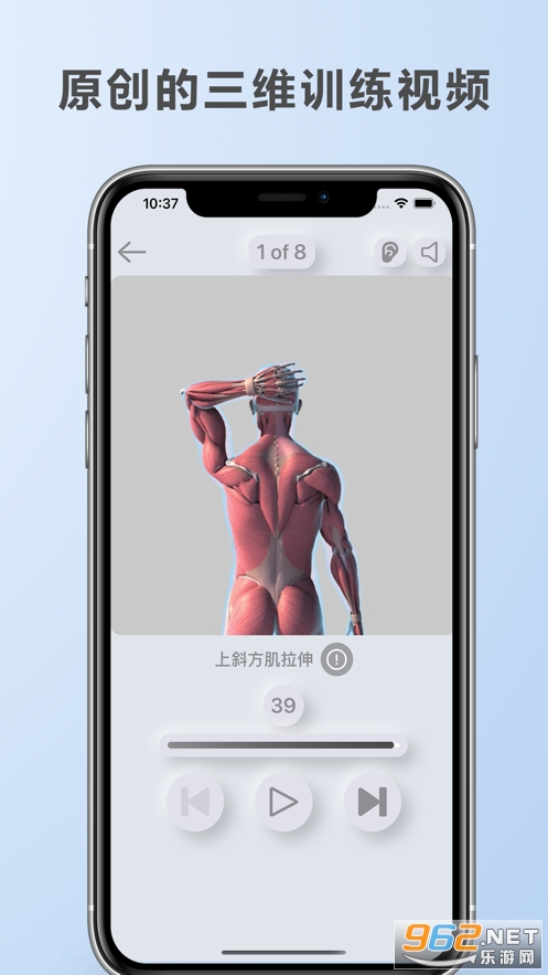 每个练习的 3D 动画演示,辅以主要和次要肌肉的详细 3D 动画