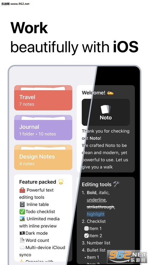 一应俱全的编辑工具,一目了然的界面设计,加上精心雕琢的动画效果,带给Noto流畅舒适的用户体验,足以胜任各类文本编辑的得力助手