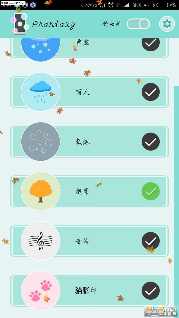 Phantaxy屏幕特效也算是一种壁纸,就是各种特效在桌面上飞,花啊,雨啊,气泡,音符什么的!
