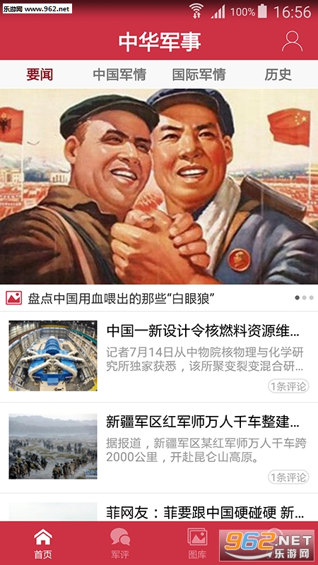 《中华军事app》是一款为军事发烧友打造的资讯类手机软件,在这里可以关注第一手中华军事新闻,还可以和各个发烧友们进行讨论,谈论军事,关注历史,心胸也会变得开阔哦,下面小编带来中华军事app下载。