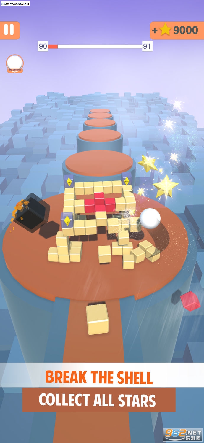 1、灵敏度控制球速度,多彩的块状形状;