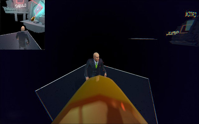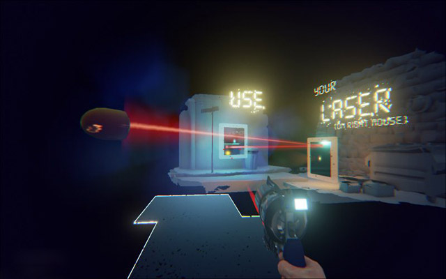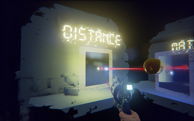 诡异的空间中,落脚点并不多,你必须一边调整射击角度,利用镜子的反弹让子弹命中自己,一边确保自己没有掉下去。