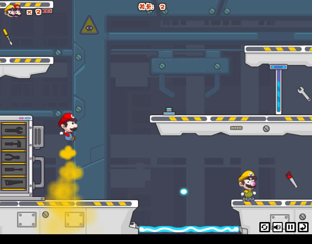 玩家要在游戏中控制两个马里奥一起来进行解谜,游戏里有很多的机关需要两个马里奥相互配合才能够得到被锁在其中的工具。