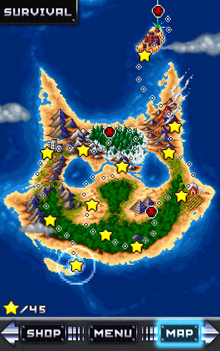 《战斗猫咪》的故事发生在猫岛上,玩家控制的猫咪将乘上飞机激战。从猫岛的地图可以看出,《战斗猫咪》的游戏主流程是一关接一关的,而且是结合了三消方式的即时空战。