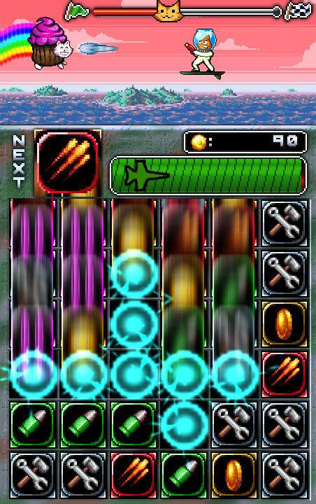 其实结合了即时战斗的消除模式,玩的时候间隔时间会很短,整个游戏流程要求你又快又巧,区别是指令的输入方式变成了四消,但因为象形图案,还有方块可以自动替换和放置的缘故,消除起来并不难,轻松爽快。实在打不过还能去商店丢钱升级武器,或者换艘更强大的飞船。
