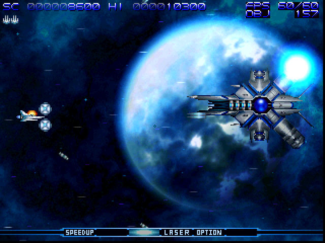 游戏可升级的选项包括速度、辅机、双倍子弹、激光等等,boss战斗前有一波小怪可以刷很多的升级物品来进行升级。第一关的boss难度比较大,一定要打到发射激光的炮筒才会有攻击效果。