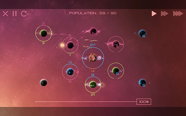 《太阳系争夺战2》是个简略化的即时战略游戏,最开始每方都会有一个自己的母星,玩家需要移动舰队去别的星系殖民,完全殖民的星系可以发展生产更多的战舰,占领了所有的星球这游戏胜利。游戏的难度还是比较高的,因为AI智能很高,战舰数量一旦被超过则就很难翻盘,所以前期一定要把握好局势,必要时则降低速度来制定好策略。砍掉了多余的元素,回归到最基础的即时策略,玩起来还是非常有趣的。
