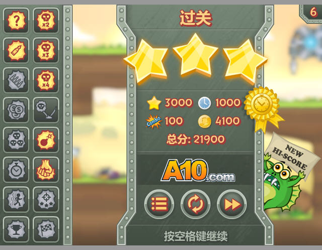 场景里有些可以弹射激光的铁板,需要玩家控制好方向精度才能准确的将怪物消灭。完成关卡后左侧将会显示玩家所得到的各种成就。
