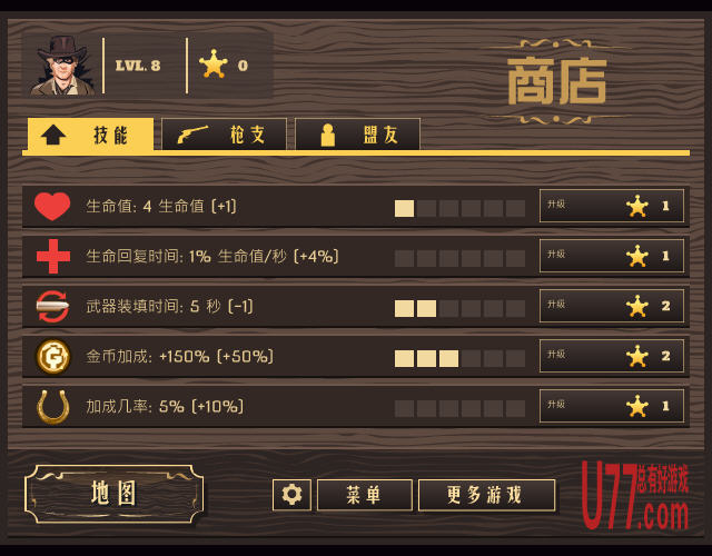 你扮演的是名抢劫作恶的西部悍匪,骑马在荒野上抢劫货车火车银行,并和其他警匪周旋枪战,玩起来有种西部枪战片的爽快感觉。通过抢钱提升等级获得属性点,在货店升级技能枪支和支援召唤。