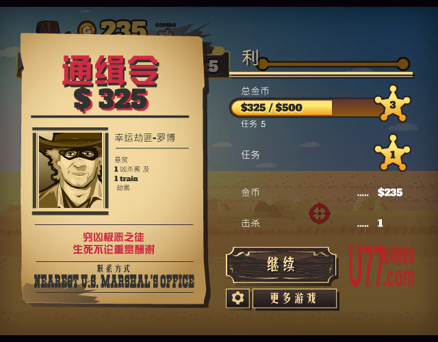 R星出品的经典西部作品《荒野大镖客》红极一时,许多游戏西部题材的游戏也套用这个名字出现了许多的山寨版,这款FLASH版的《荒野大镖客2》算是一个品质比较高的作品。