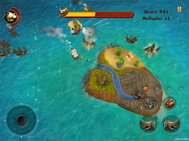 游戏中,玩家需要操控自己的战舰守护画面中央的小岛,保护岛上的财宝,击沉敢来抢劫的海盗,游戏中还会出现一些传说中的大海怪,击杀它们可以获得更高的评分以及金钱。