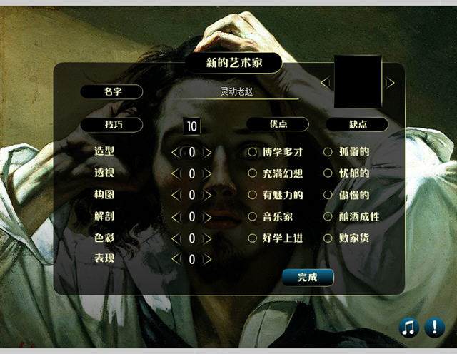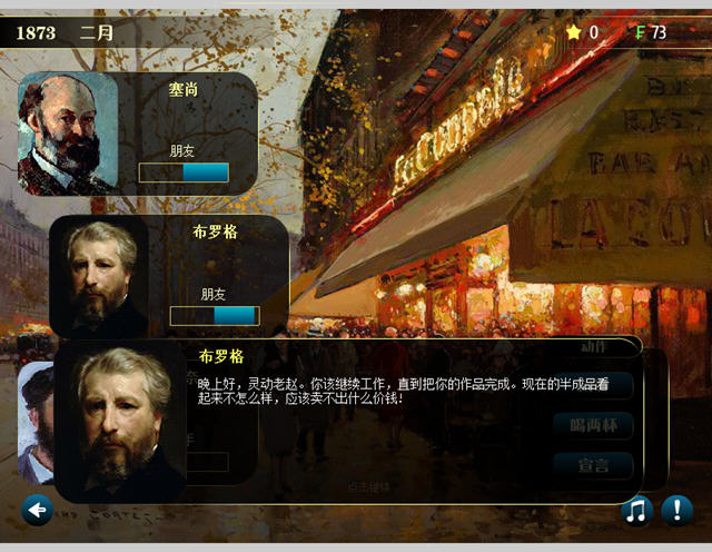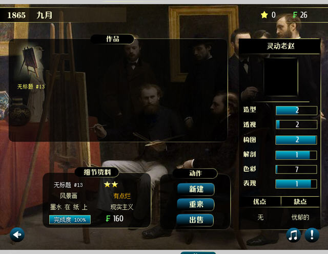 以画家为主题的游戏比较少,这款游戏里玩家扮演的是一个初出茅庐的画家,前期贫困潦倒,但是随着不断的学习增长,将会画出越来越多的知名作品。