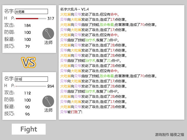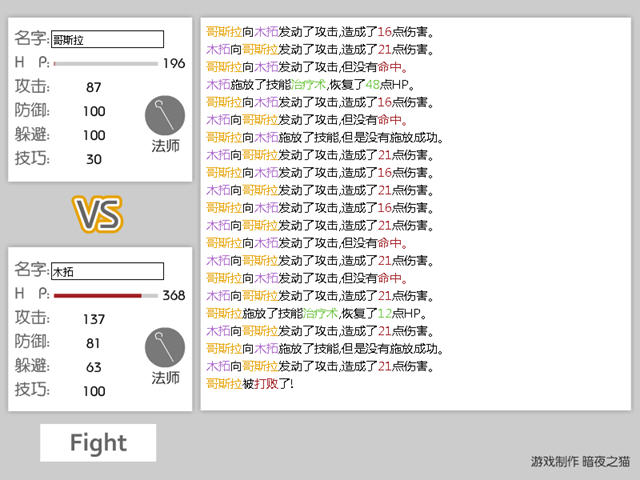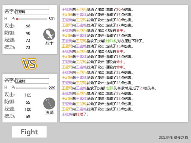 游戏会根据不同的名字,生成相应的属性和职业,目前有3种职业:战士、弓箭手、魔法师,每种职业都可以施展不同的技能。