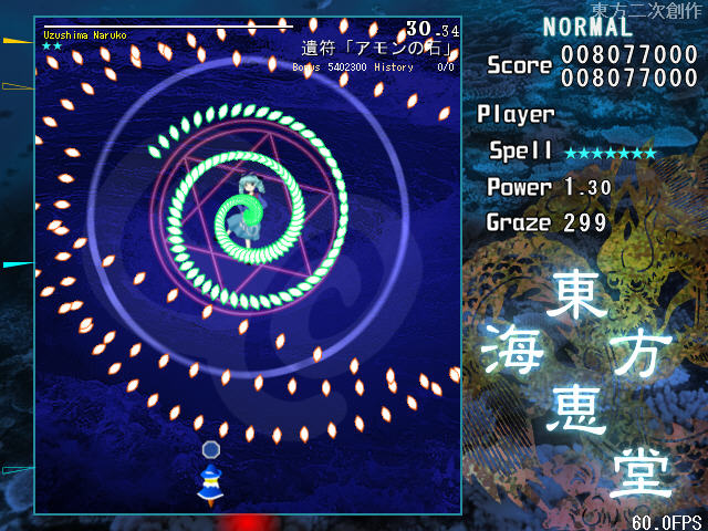 东方弹幕系列的又一个作品,本作的优秀之处在于玩家可以在游戏中通过收集H和O字母来增加自己的保险以及额外生命数量,对于新手来说是个不错的福利。