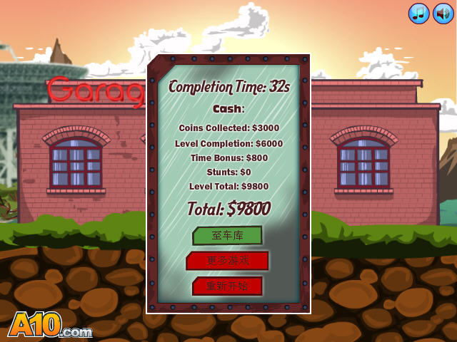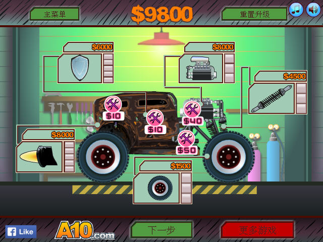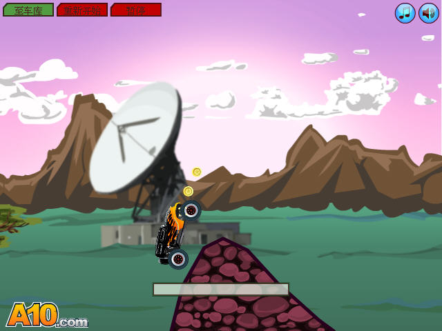 游戏看起来简单,但是要玩出花样可是不容易,要尽量利用山坡来让车辆飞起并翻转来获得高分,但是注意落地可要小心,如果用车顶落地可是会散架的哦,获得金钱之后可以在车库来修复或者改装自己的车辆,给他添加推进器,升级轮胎等等。
