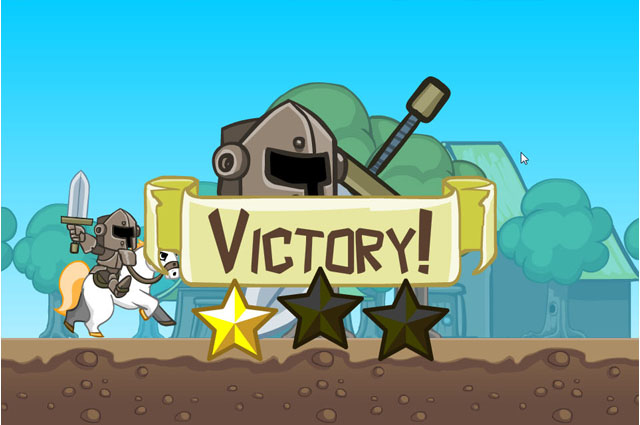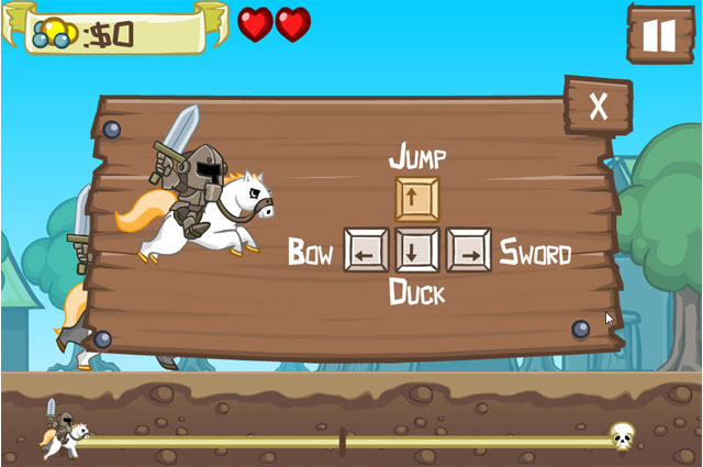 这是一款非常好玩的小游戏,有点难度并非常有挑战性,游戏中有些怪只能用剑砍,有些又只能用弓箭才能射的到,而且弓箭需要按住←不放来调整角度,这对不断迎面而来的各种障碍更加危险,记得一定要升级装备,武器可以增加攻击里,盔甲可以增加撞到障碍物或者被攻击的次数,想要获得3星可是非常不简单哦。