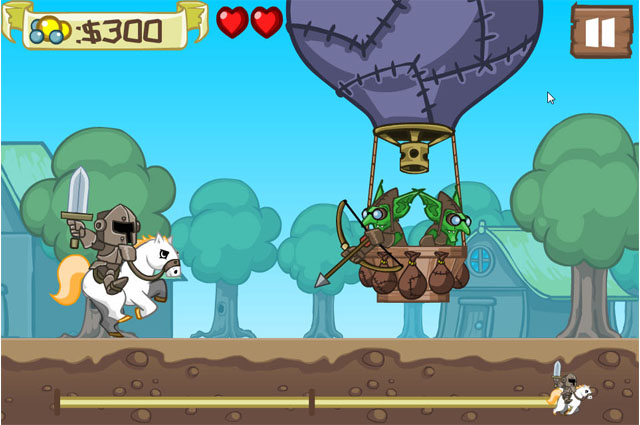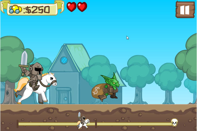 皇家骑士是一款很有趣的跑酷游戏,与众多无尽跑酷游戏不同,本作是关卡制的,玩家在跑酷的同时除了躲避各种障碍物,还要击杀各种地精山贼,野猪等等,而使用的武器也能通过关卡中收集到的金钱来升级。