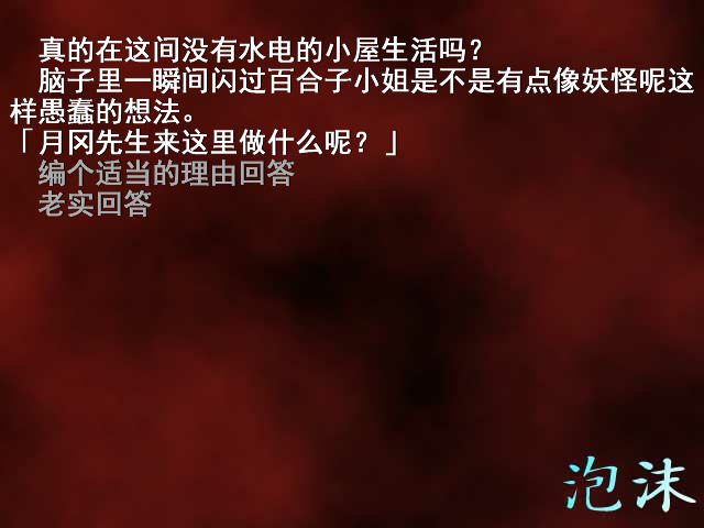 很典型的日本恐怖小说类型,虽然是电子小说类的游戏,但是通过不同的对话选择也有4种不同的故事发展和结局在等着你,些许诡异的音乐+扣人心弦的故事描写,一定会让你刺激的汗毛直立。