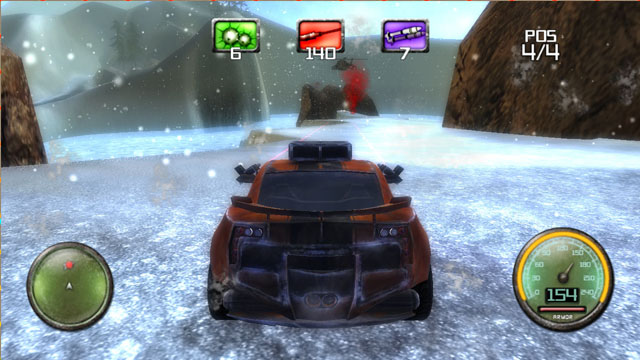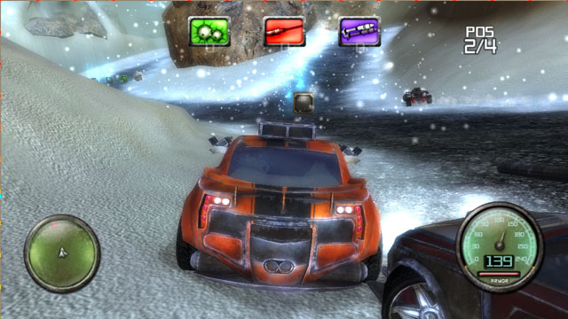 漫天飘雪的3D赛道,紧张刺激的死亡飞车,只能用一个字来形容“爽”,以最快的速度捡取到武器弹药之后,就让我们来战个痛快。每辆车都装载有3种不同的武器,大致分为陷阱类,轻武器类,重武器类,分别用三种不同的颜色代表,赛道上可捡取的箱子颜色与之一一对应。
