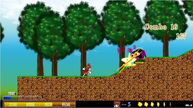博丽灵梦:初心者手向,消耗斩味适中(约30%)能够稳定输出(这里顺便提一下斩味槽,就是画面左下角那个显示100%的东西,当斩味是100%时斩击的威力最高)通常可以连4下,第3下的时候按“上”键可以将敌人浮空,对Boss必备技能,辅动键是配合左右做出紧急回避,必杀是天上降下刀子雨的怎么看更像是咲夜的迷之技能。