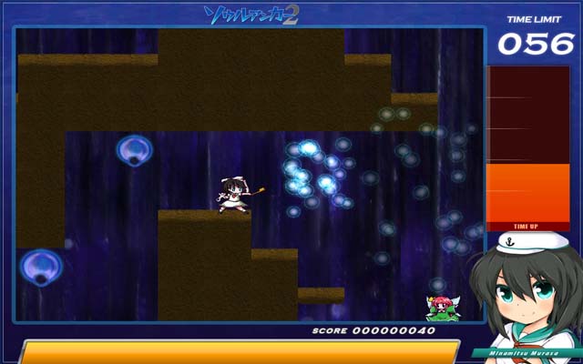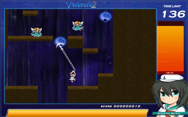 含有解密要素的ACT,主角是神灵庙的水军幽灵,村纱水蜜(大约是这个名字),游戏流程基本就是利用钩锁(完全是船锚好么)不断前进,很有生化奇兵的感觉。不过这个要简单的多,这里好歹不用钩锁还是能跳的……不过钩锁的方向控制有点生硬,玩久了对手指的负担有些大啊