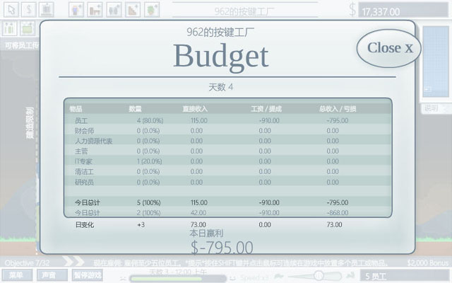 玩家在游戏中将从各方面下手管理一家属于自己的公司,除了一般的建设外,还会有员工的饥饿度,快感度等设定,而你想做一个大方的老板,还是一个周扒皮就全靠自己的意志来决定了。