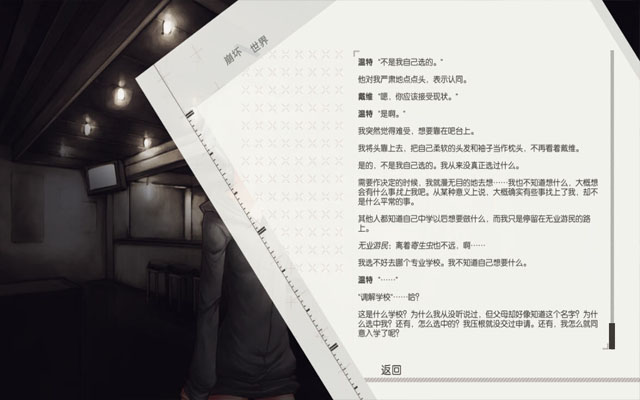 游戏基本就是本电子书,在配合好听的背景音乐下欣赏这个有趣的解谜故事。游戏有随时查看对话和记录的功能,方便玩家回顾剧情,完成游戏之后也可以查看CG和故事概述。