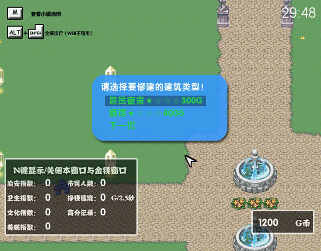 游戏比较简单,可以建造和升级的建筑并不多,主要是在限定的30分钟内建造尽可能多的建筑来增加各项属性。经营类游戏嘛,钱是根本,所以一定要多造酒馆与化工厂,但是化工厂虽然成产快,但是会有污染,所以管理所也比不可少,而且卫生度高了结束时的评分也会高。