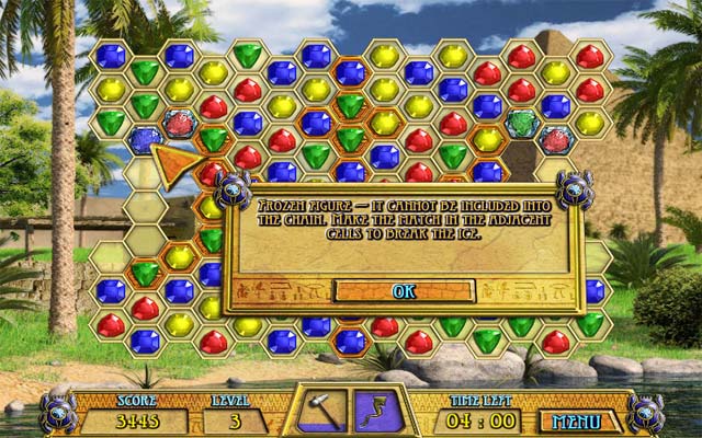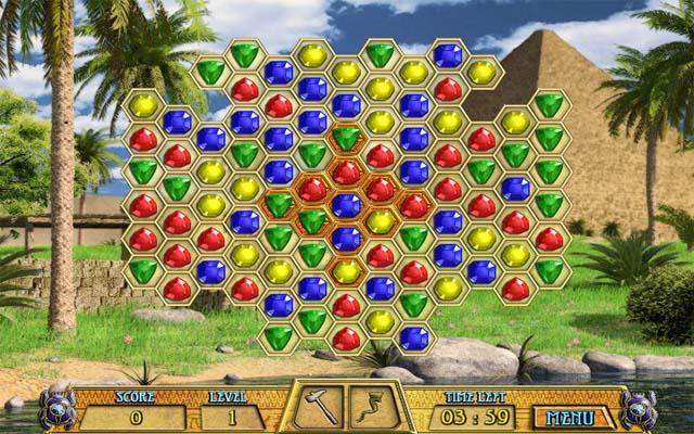 以神秘的古埃及为背景带来了传奇色彩,游戏的玩法很简单,将三个或三个以上的同样颜色形状的宝石,通过点击并拖动将宝石链接到一起,就会消失。
