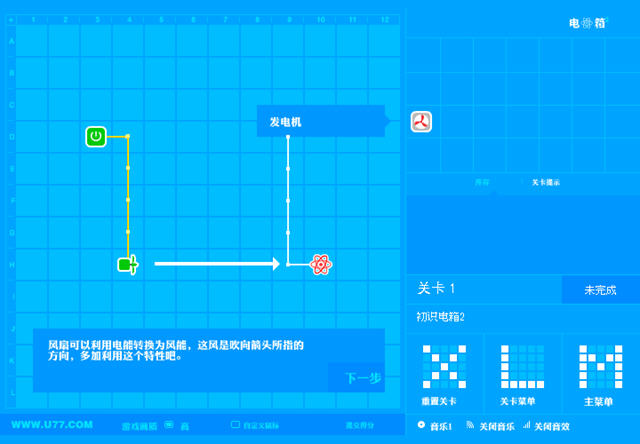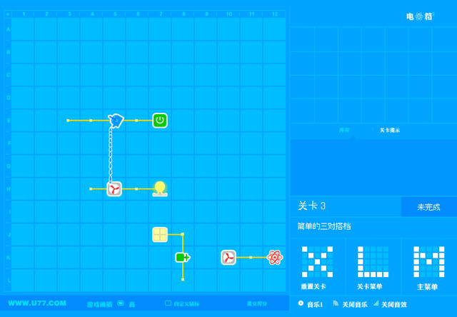 游戏开始后,把右边工具箱里的工具用鼠标拖到左边工作区相应的位置,然后开启基础电源,让工作区的“工作流”产生连锁反应,最终驱动目标开关就可以过关了。
