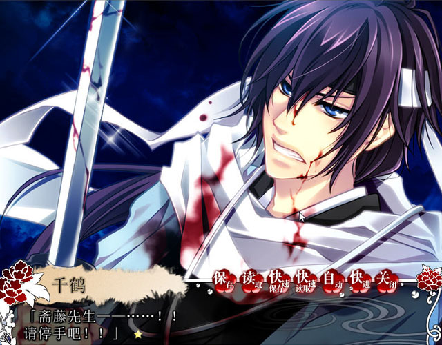 《鬼为谁鸣泣》是一款薄樱鬼同人游戏,本作中涉及到的游戏人物包括新选组的冲田、千鹤、斋藤、土方,游戏中会多次出现血腥的画面,从刚开始游戏的时候斋藤为了保护主人公千鹤,也就是玩家所控制的角色从而使得鲜血满身。