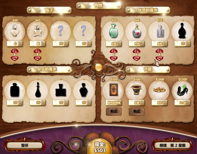记得每一个关卡完成都要去购买足够的香水进行下一关哦,不然就没有足够的货物可以出售了。