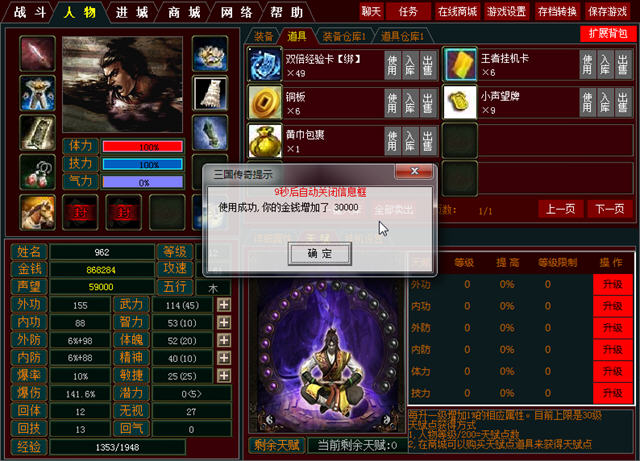 这款三国题材的挂机游戏中加入了很多类似网络游戏的内容,当然玩家如果只为挂机的话也可以完全当作单机来玩,无需理会网络交易的方面。