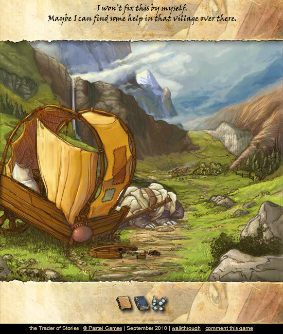 主人公的马车?(反正不是马)坏了 ,首先拿轮子(坏车轮) 然后车上有食物拿下来 扔给那个宠物(不是马的那只),然后可以离开了。在中间有个分叉,貌似有朵花(野菊花?)拿下, 还有块石头点下有文字。右边是个森林,里面有铃铛记得拿。好回到原来的路,走进村庄。有个破房子, 有只猫(拔猫毛),有份信点下(拿到道具了隐藏人物谁?) 进主村,见人就问隐藏人物。貌似先去马厩把那头不是马的东西安置好,顺便问下隐藏人物然后别人谈条件了 要找她男人。- -! 去铁匠铺 找人修车轮(要给钱啊 坑爹),顺便问下隐藏人物。(问隐藏人物其实是搜集故事)为了最后卖故事给市长 修车轮要付钱。。。铁匠铺上面有个房子 有个铃,但是没铃铛,按上在森林里找到的铃铛,点铃铛进入屋子。屋子了好好搜搜,可以找到护身符,煮药的罐子。找那个女人谈话可以搜集故事,在顺便问问他隐藏人物的事。出来去酒馆 看到醉汉 就是那个我们要找的男人, 拔他的毛, 然后附近找下有个火石拿了。 找老板谈话,还是要问隐藏人物。顺便拿点东西空瓶子。记得还要买酒。酒馆出来,有辆车,找老板说话。 买秘方2个。一个是护身符为了带醉汉见他老婆,另一个是药水秘方为了搞药水倒湖里(还是为了故事)。PS: 要是钱不够可以先去找市长 谈谈话,他会给你点钱买你搜集到的故事。市长左边的屋子可以去到湖边,拿荷叶。 好了东西基本拿得差不多了。合东西呗, 回到最初的小破屋,用火石点木材,把锅放上去。按着秘方上的配料来呗。(花+男人头发+护身符,这是要带男人回家的道具) (猫毛+荷花+酒+空瓶子 这是那个要倒湖里的药水) 去酒馆把护身符套醉汉身上带他回马厩见老婆,去湖里倒药水搜集故事。到这里 故事应该算是搜集完了,要是还没有, 那就问问刚才几个人物(屋子里的女人,马厩要找男人的女人,铁匠铺老板,酒店老板关于隐藏人物的事 记得要把那个隐藏人物的道具用在这几个人身上)去市长那,卖故事给他。然后再去那个商人那里,把2个秘方卖还给他。这下够钱去铁匠铺拿回车轮了。回到村庄外的马车旁,把轮子按上。 终于可以上路了, 尼玛真心累啊。。。。哈哈哈。
