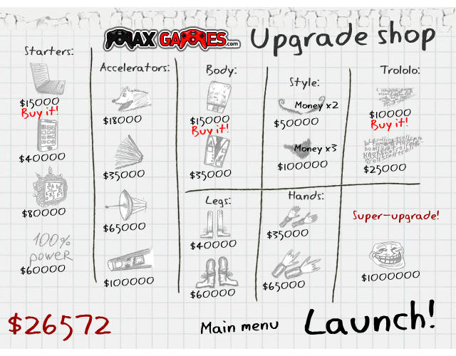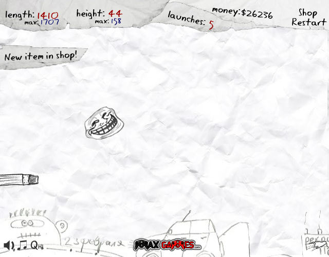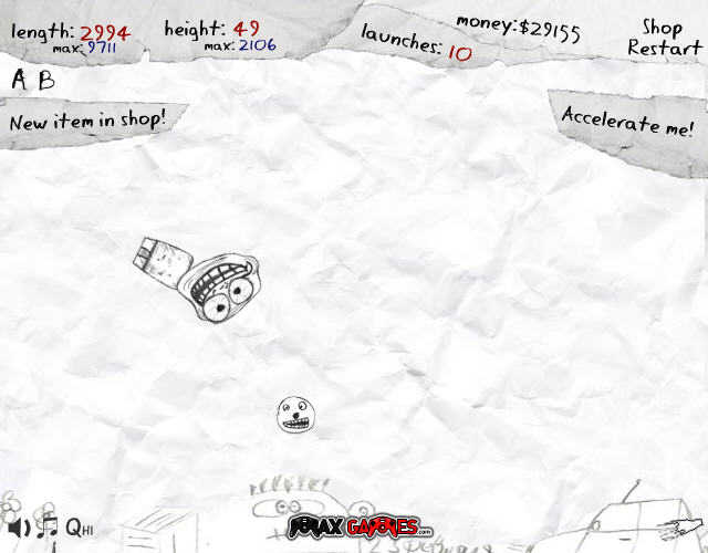 借用了暴走漫画形象的比距离游戏,内容注定是要恶搞的,各种升级元素都非常搞怪,绝对是在一般正统游戏中不存在的。游戏的目的就是尽可能的飞的更远,赚够100万以揭开惊人的“秘密”。