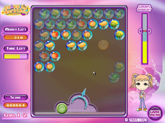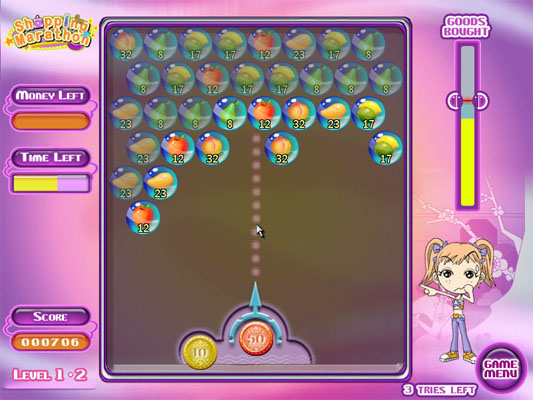 创 意:购物马拉松采用了类似泡泡龙游戏的玩法,在过关要求上采用了新的规则,每种物品具有固定的价格,而玩家需要用所给的硬币去购买,物品既符合硬币的限制,还要尽可能购买更多的东西。