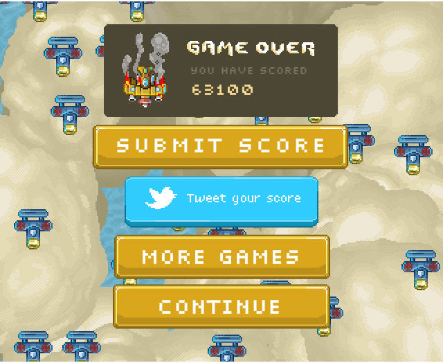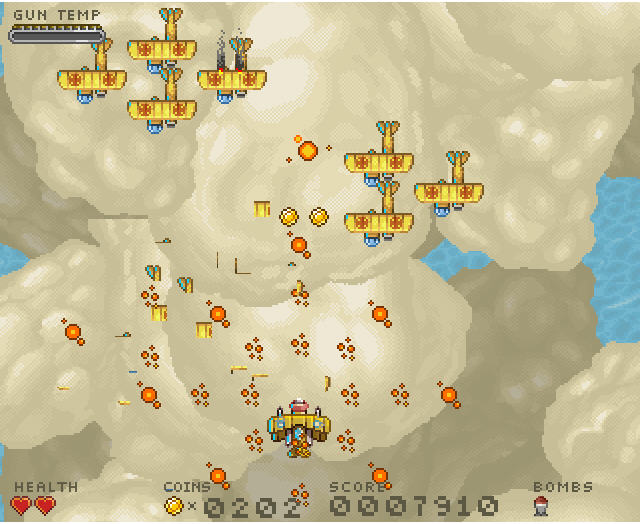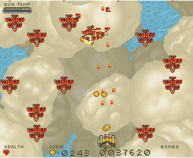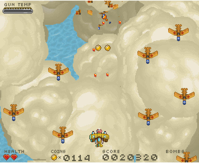 摧毁敌方飞机可以获得金币,金币在游戏中非常重要,玩家可以使用金币在菜单中购买生命、炸弹以及强化武器等,如果发现生命不多,建议先暂停游戏去买点血。