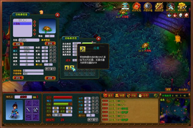 游戏目前开放的部分有三个,东海岩洞、深海沉船、大雁塔一层,可以抓宝宝,而且升级也跟官方一样需要玩家自己手点,然后分配属性。