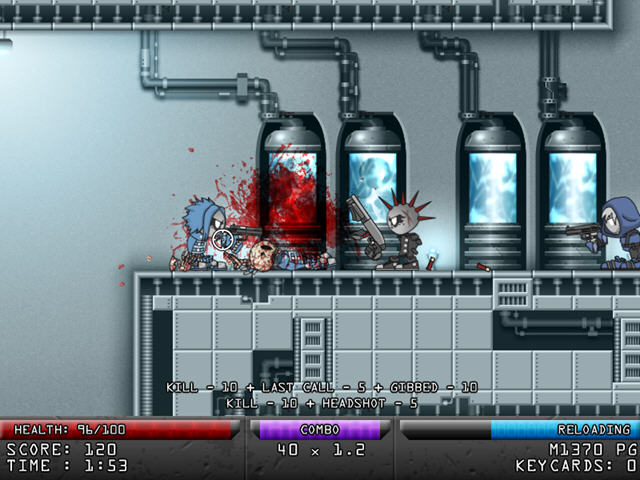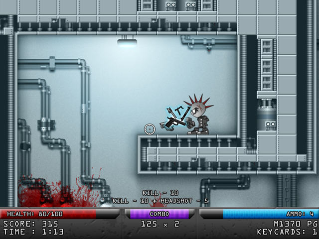 非常血腥的一款横版射击游戏,选择你的主副武器,然后去消灭不断涌来的成堆敌人,地图上会有各种道具让玩家去收集。