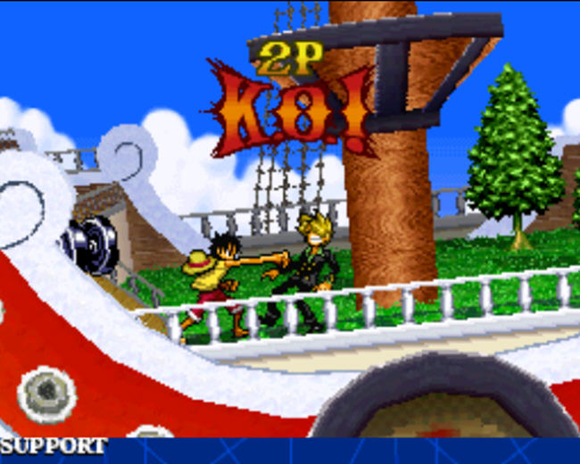 《海贼王 巨人战争》在前作的基础上进行了大幅度的提升,无论从画面,音效,系统,上来看都有了一个质的飞跃。本作废除了前作的卡片系统,改成4人大乱斗的模式来进行游戏,战斗方式相似于任天堂很早之前在DS上发售《JUMP明星大乱斗》,就连人物风格,场景画风也基本相同。