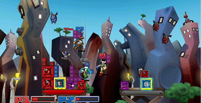 迅猛雷霆大作战》是一款结合多种游戏元素的动作冒险游戏,在游戏中用类似与俄罗斯方块的方法建造属于自己的武器,同种颜色的方块累计在一起,无缝堆积方块越大,生成的武器越大。而不同形状方块玩家可以通过消灭小怪物的爆出来,当然在建造自己武器的同时,双方武器都处于对射状态,就看谁的建造速度大于被破坏速度了,玩家可以在堆积方块之余可以干扰敌人。