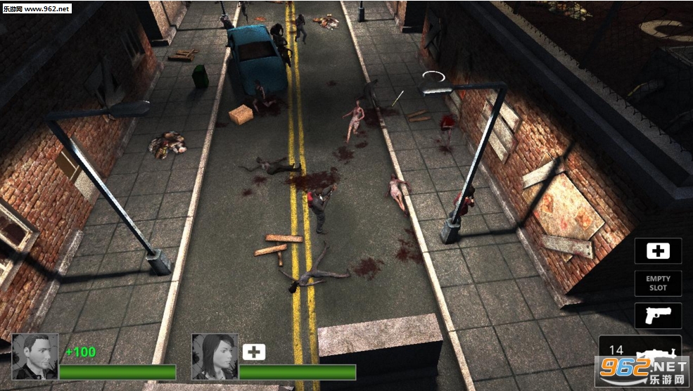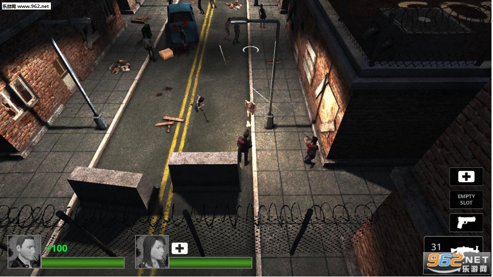 这可以说是一款添加了情侣元素的《孤胆枪手》~玩法与后者类似,都是由玩家控制人物在这个被Z病毒感染的丧尸围住的城市里杀出一条血路。