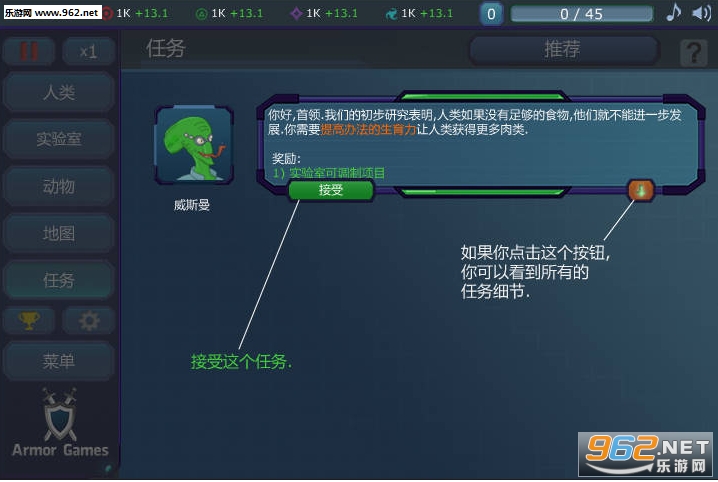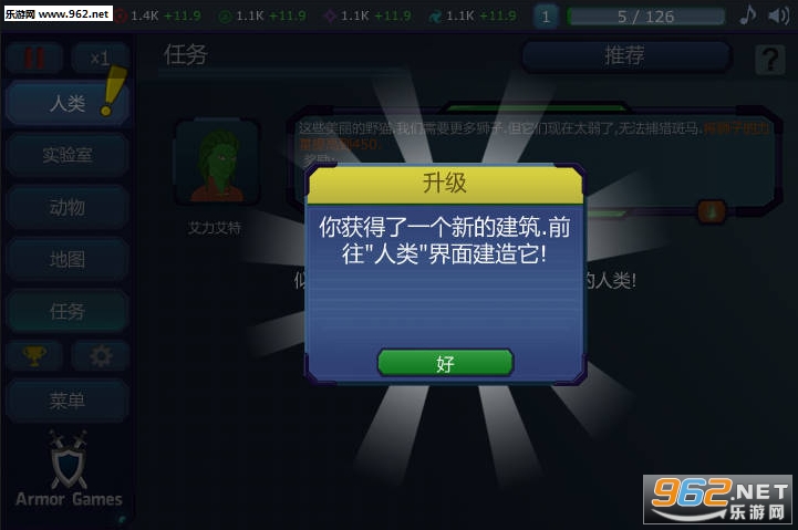 在探索栏中接受各种外星人提出的要求并完成之,可以得到相应的回报。回报中会包括各种人类建筑,得到后就可以建设在土地上,从而推动人类社会发展。也正因为如此,玩本游戏时最重要的是要清楚了解各种要求,否则游戏就会无端变得艰难。
