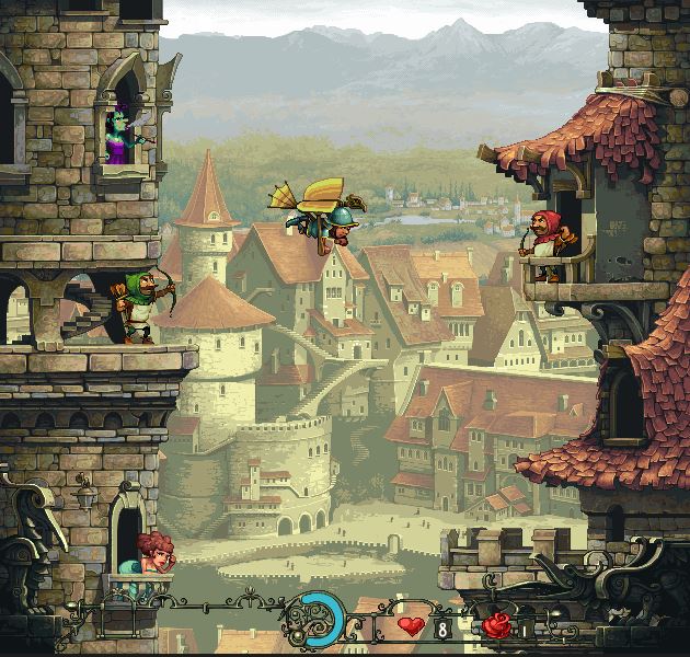 骑士们需要爬上城堡最高的了望塔跳下来,在下降的过程中,骑士需要利用滑翔服躲避城堡中出现的各种障碍威胁,在重重障碍中需找女孩,并获得他们的青睐。